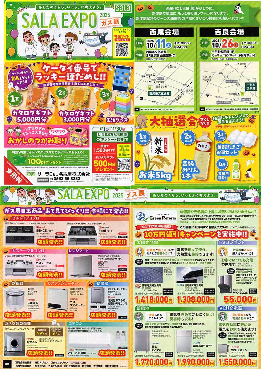 | 2025年9月20日 |   当社が協賛参加しているガス展「SALA EXPO2025」 10月11日は西尾文化会館 10月26日は一色町公民館 にて開催いたします。 お値打ち価格のガス機器はもちろん、抽選会などもありますので、ぜひご来場ください。 ※ご相談・商談・ご契約の際は「ニイミガス」と伝えていただけるとスムーズです。