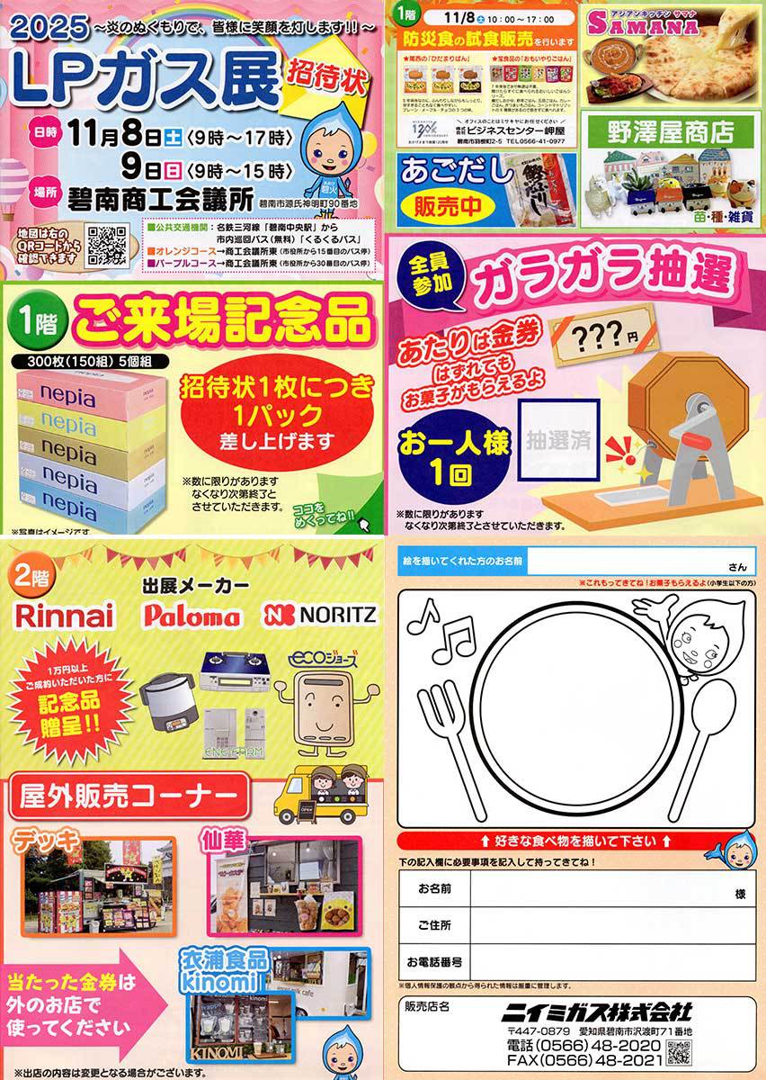 | 2025年9月28日 |   11月8日(土)と9日(日)は、LPガス展を碧南商工会議所で開催します。招待状は当社お客様に順次お配りしています。